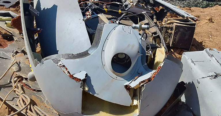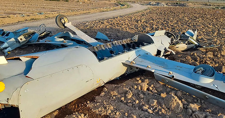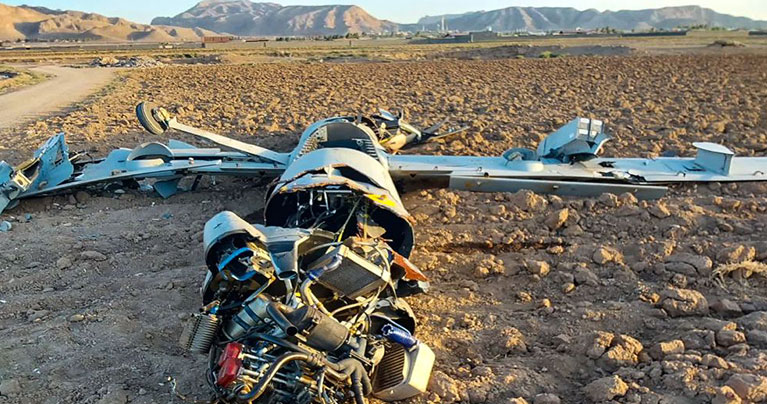 ইরানের ইসফাহানের মাটিতে ভেঙে পড়ে আছে ইসরাইলের বিমানবাহিনীর একটি হার্মেস ড্রোন। ছবি: এএফপি