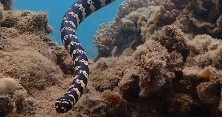 দেখে মনে হতে পারে কাপড়ের তৈরি কোনো খেলনা সাপ। কিন্তু না এটি বিশ্বের সবচেয়ে বিষধর সাপের মধ্যে অন্যতম একটি। যদিও এর কামড়ে মানুষের মৃত্যুর ঘটনা খুব কম। কারণ এদের বাস ইন্দো-প্যাসিফিক প্রবালপ্রাচীরে ৮০ মিটার গভীরে। পাতলা, ১ মিটার লম্বা, দেহে হলুদ-সাদা দাগ। প্রকৃতপক্ষে সমুদ্রের মধ্যে ডুবোইস সি-স্নেকের পরই বিষধর। তবে শান্ত; জালে জড়ালে তবেই কামড়ায়।