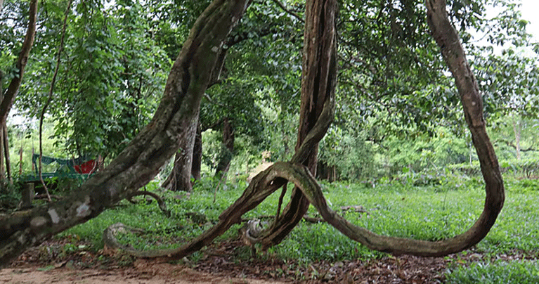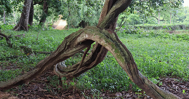 গত শুক্রবার বিকেলে সেই পথে চলতে চলতে দেখা হয়ে যায় একটি গাছের সঙ্গে। টিলার মতো স্থানে গাছটির লতার শরীর ছড়ানো। তবে নামে গাছ হলেও দেখতে অন্য সব গাছের মতো নয়। না আছে ঊর্ধ্বমুখী কাণ্ড, না আছে শাখা-প্রশাখা। গোড়া থেকে বড় রশির মতো বিশাল সব লতা কাছের আম, কাঁঠাল, বটগাছকে আশ্রয় করে ঝুলে আছে, জড়িয়ে আছে। লতার মতো হলেও এটিকে সবাই গাছই জেনে এসেছেন। সেভাবেই সংরক্ষণ করে চলেছেন। কবে কোন শতকে এখানে গাছটি জন্ম নিয়েছিল, কেউ জানেন না। গাছটি এখন লোক-ইতিহাসের একটি অংশ।