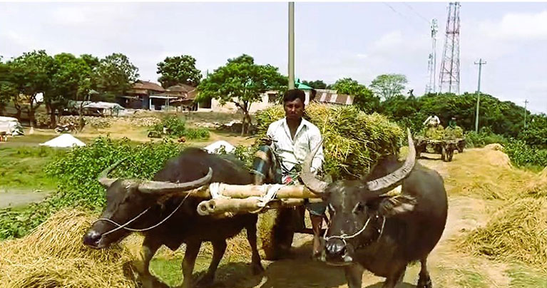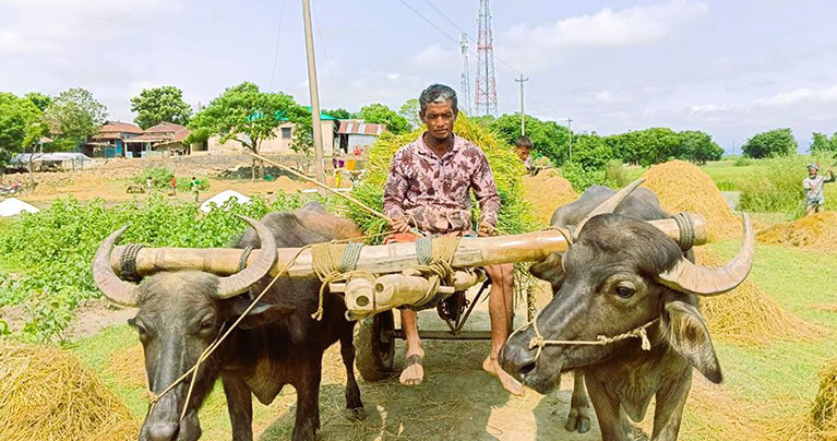 সুনামগঞ্জের তাহিরপুরের নোয়াল হাওড় থেকে পাকা বোরো ধান কেটে মহিষের গাড়িতে করে নিয়ে খলায় ফিরছেন কৃষক।