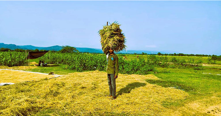 সুনামগঞ্জের টাঙ্গুয়ার হাওড়ের সর্বশেষ সীমানা মধ্যনগরের মুক্তার খলা (বিল) হাওড় থেকে মাথায় করে  বোরো ধান নিয়ে যাচ্ছেন কৃষকের খলায়।